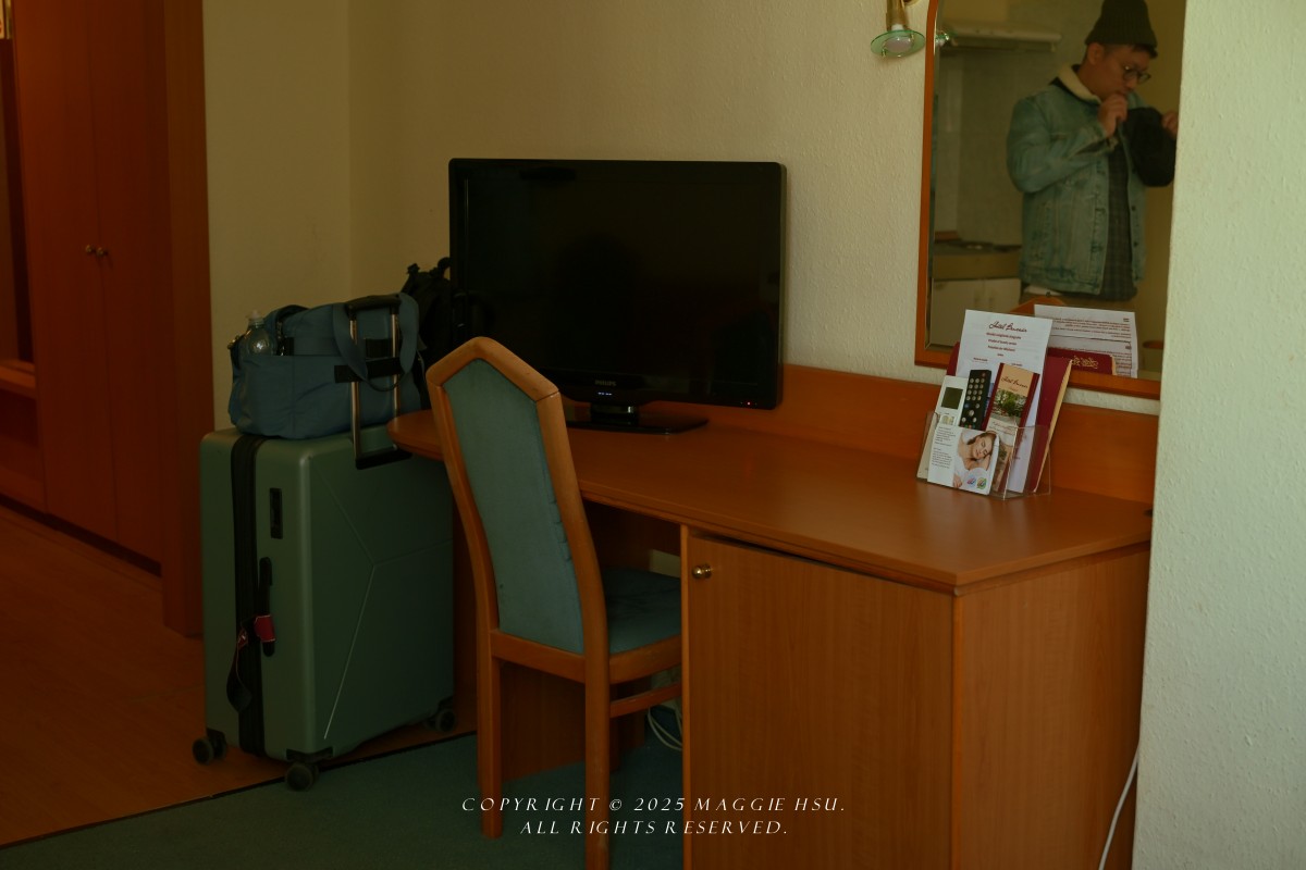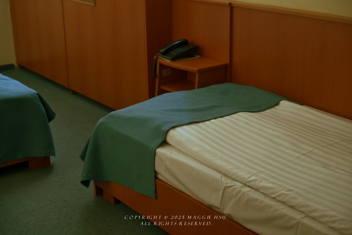 白天房間採光非常好,不會直曬,很柔和那種,床鋪軟硬度也剛好,睡起來符合人體工學??但床頭都沒有插座(好像吧)少了安全感哈哈,書桌下有接了延長線的插座,因此還算夠充電不會吵架。