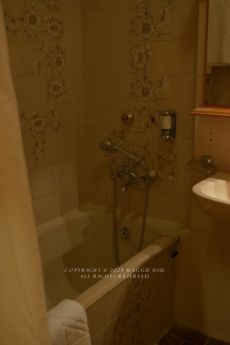 廁所就是基本款,居然還有浴缸整個CP值爆高,很復古風的浴缸,磁磚有花紋的圖樣。隔音部分就一般般,偶爾可以聽到管線的聲音,樓上的腳步聲。至於街區實在是太安靜了,所以不會有戶外人車的噪音,大概是這樣。