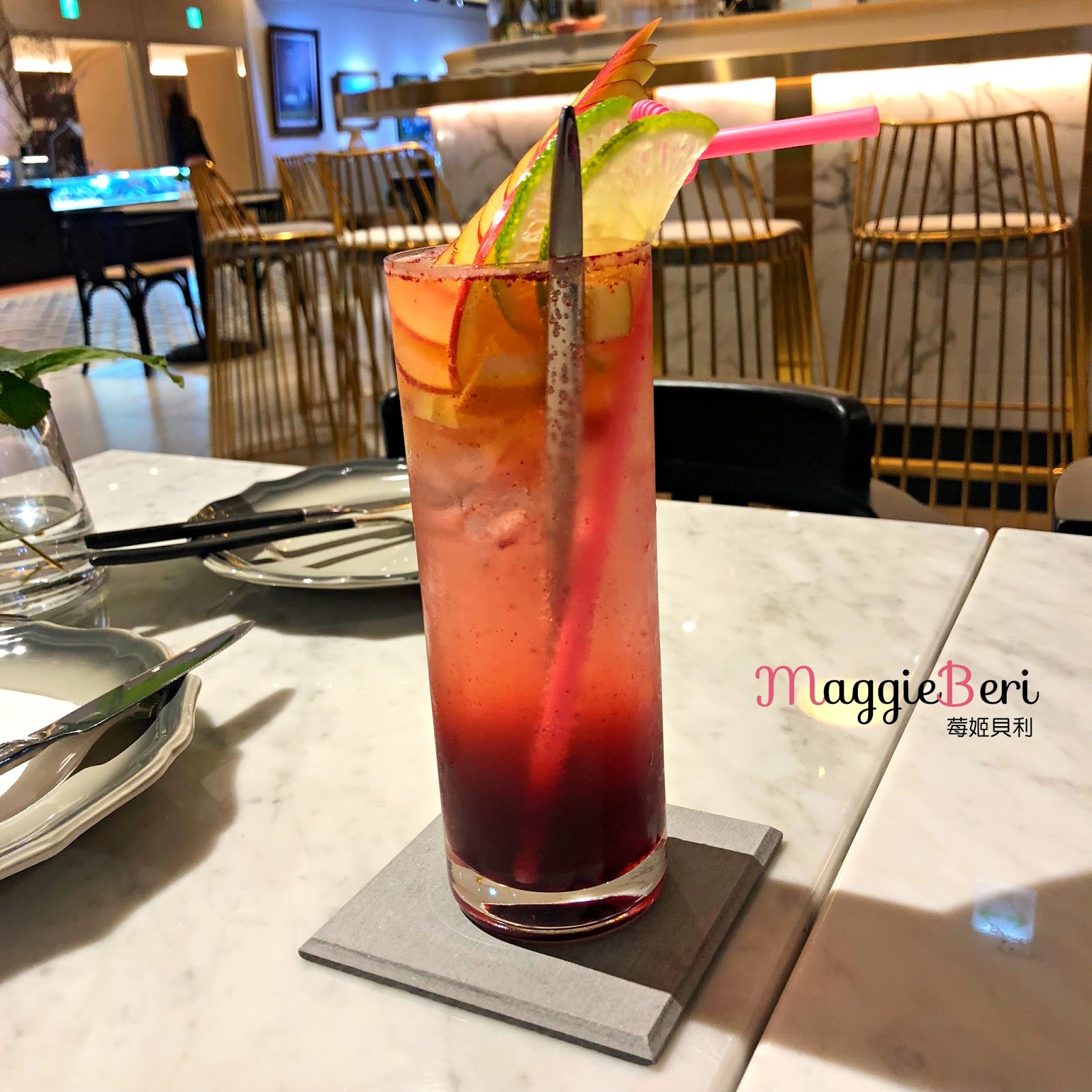 氣泡飲有莓果的味道,彷彿躺在沙灘上,來一杯冰涼的熱帶水果茶,就是這沁涼的感覺。