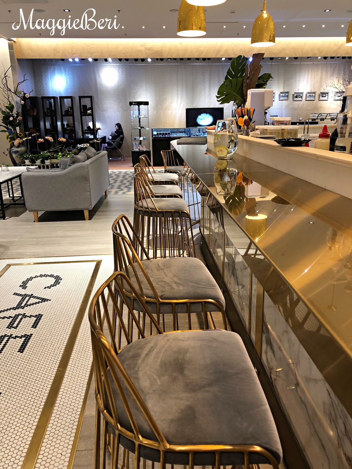 ▲ 店內是開放式空間,一覽無遺十分寬廣,咖啡廳內的設計,以大理石作為基底,搭配金色系,營造一種典雅貴氣的感覺,店內充滿大理石及金屬元素,非常漂亮。