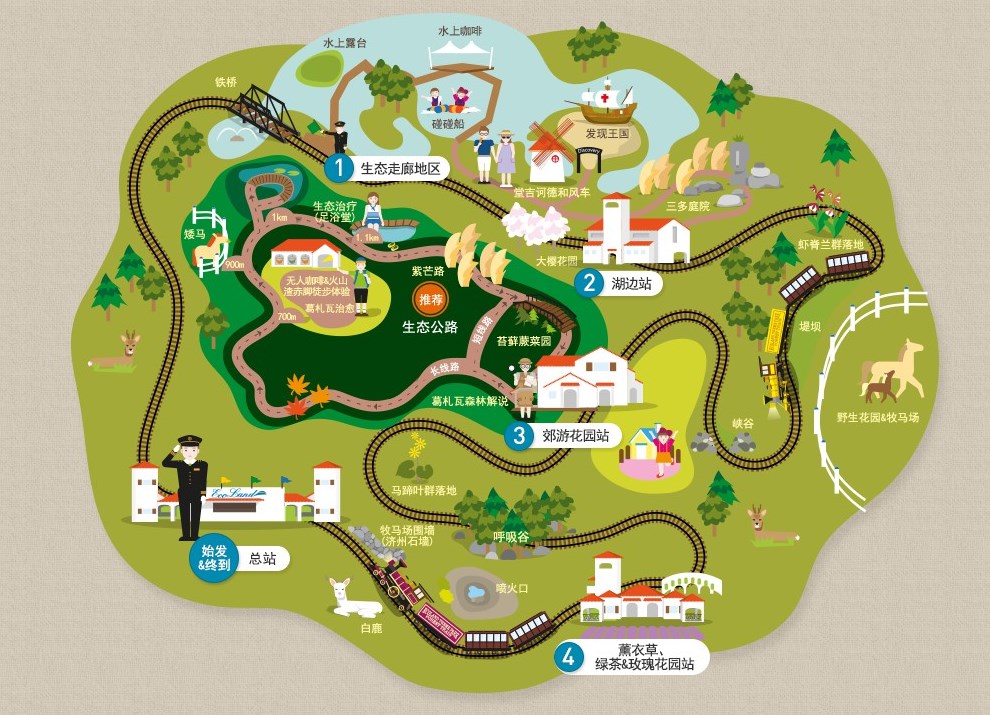 火車路線:總站 – 生態橋(Eco bridge)站 – 湖畔站 – 野餐花園站 – 綠茶&玫瑰園站