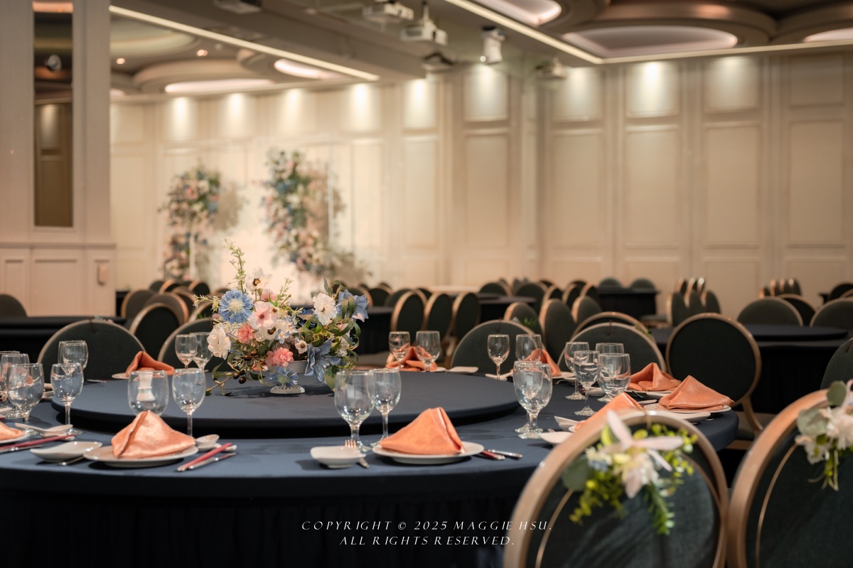 整體以沉穩的藍色為基調,搭配花藝點綴,既有典雅的氛圍,又帶著青春與活力。天花板的弧線設計柔和又富有生活感,沒有過多裝飾,保留了恰到好處的留白,呈現出一種自在、舒服的婚禮美學。