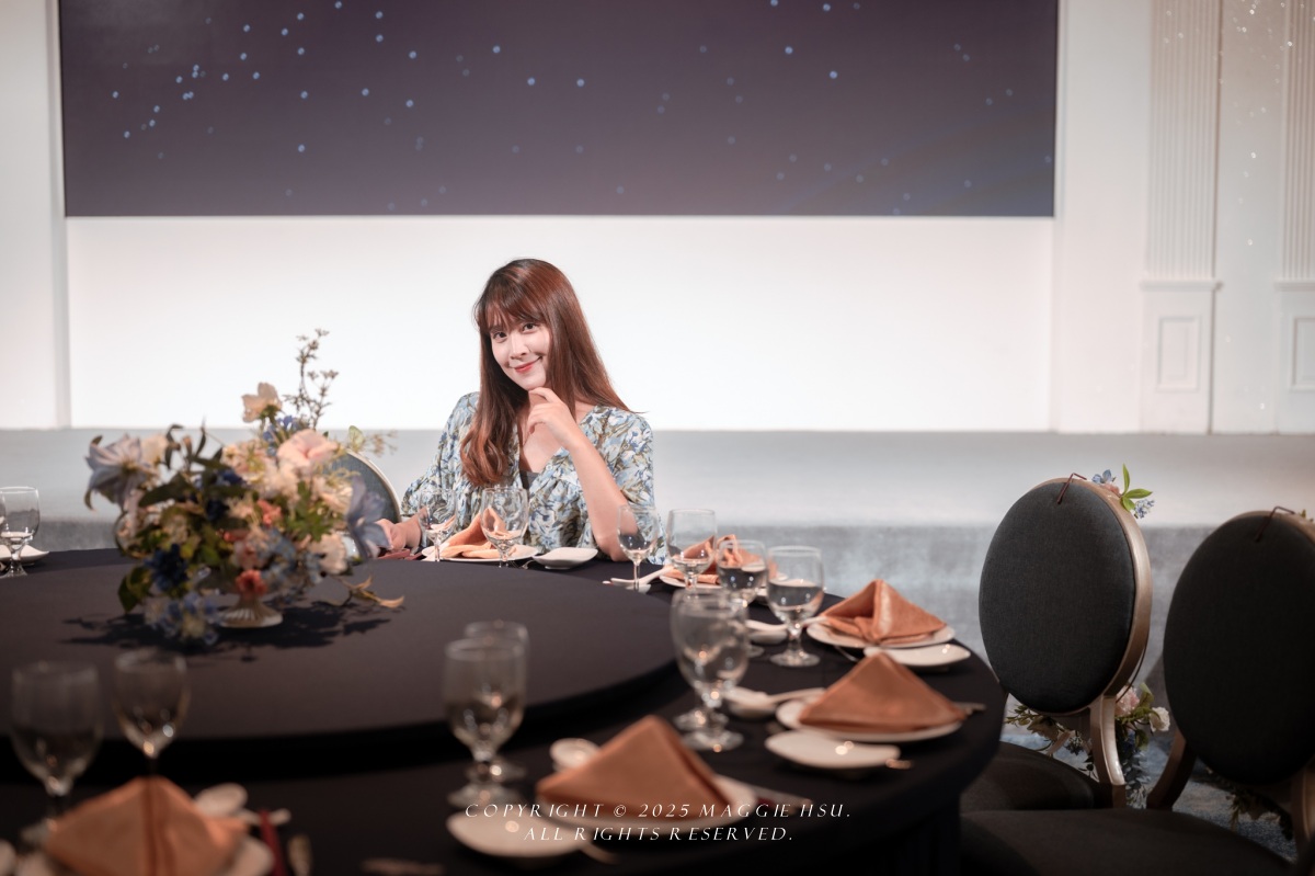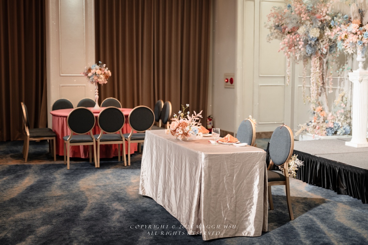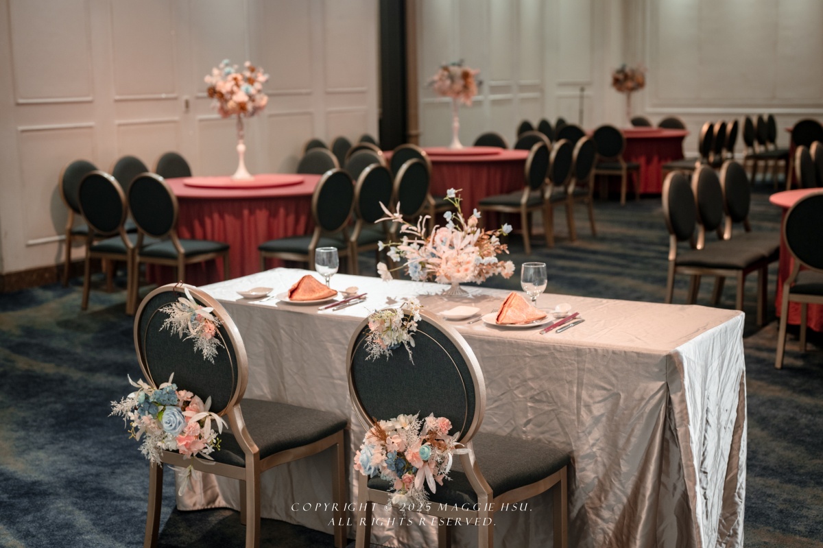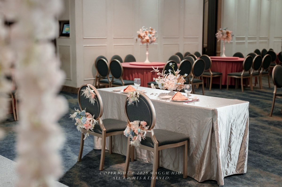 那天到現場看到的擺放形式,沒有傳統的主桌設計,只有新人單獨的長桌,桌型都可以依需求調整。其實我自己也比較傾向這種方式,減少尷尬感,特別像我這種I人,不太會社交的族群(笑),可讓婚禮氛圍更自在輕鬆呢!