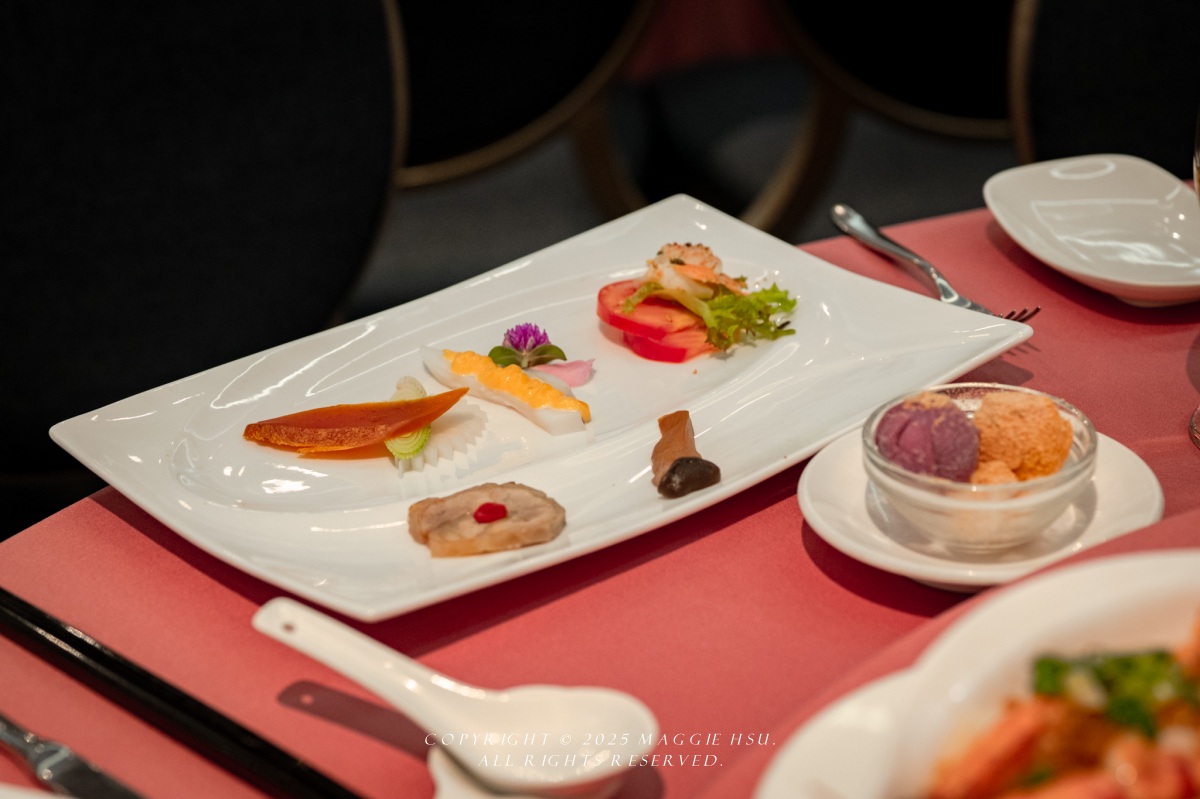 這道冷盤拼盤可以品嚐到烏魚子、醉雞、冰卷、澳洲龍蝦、杏鮑菇。