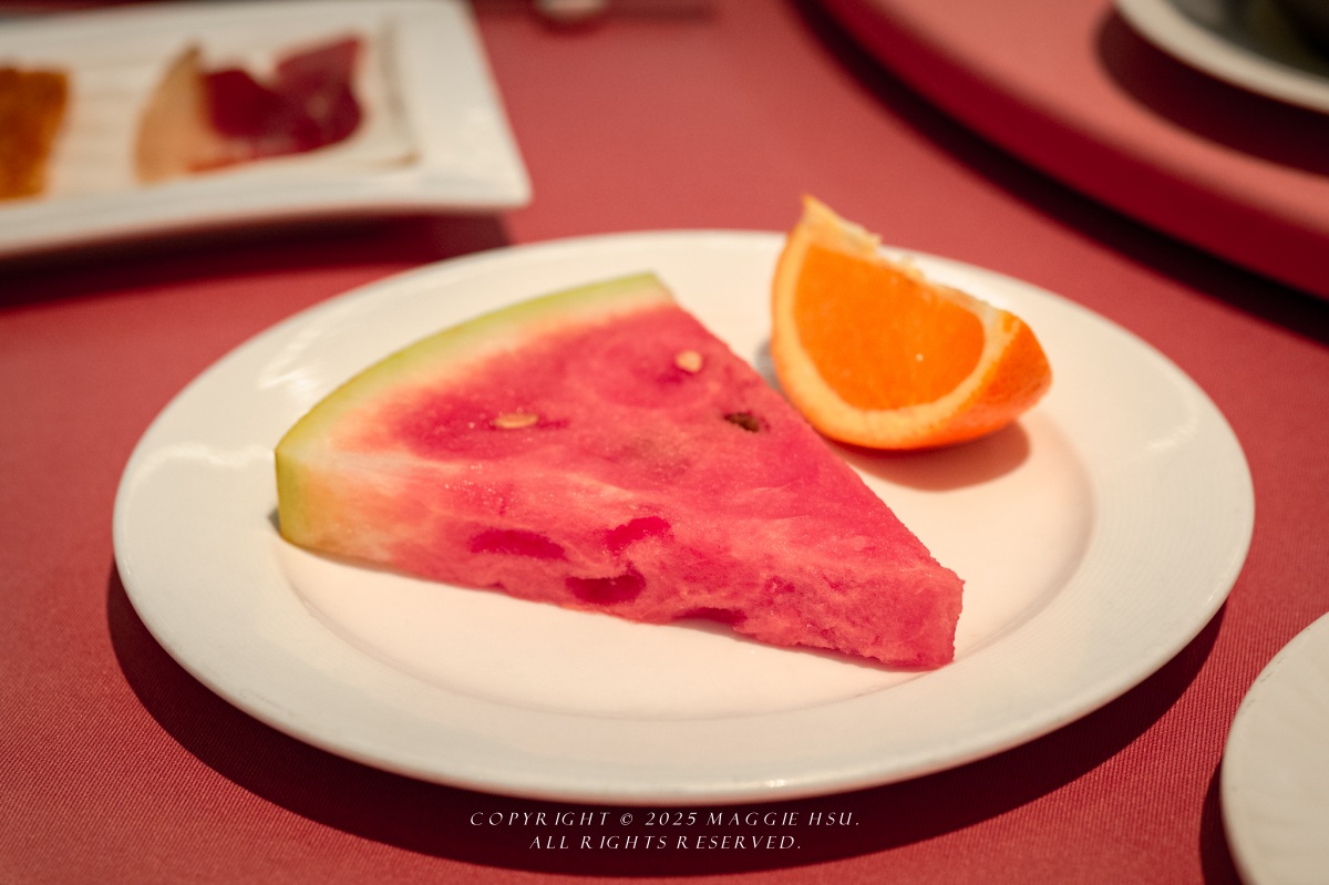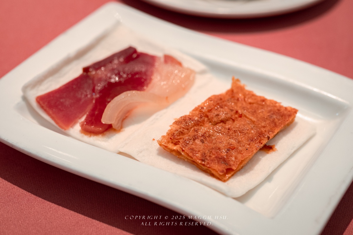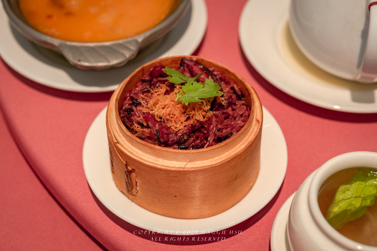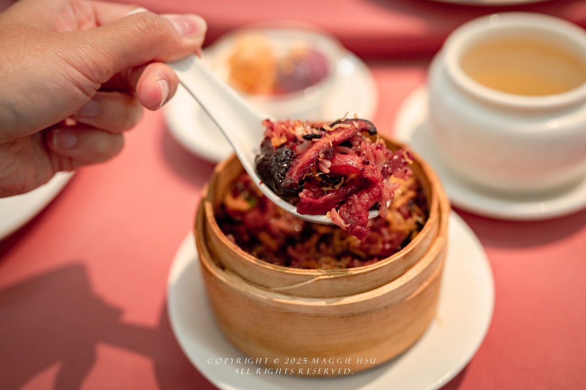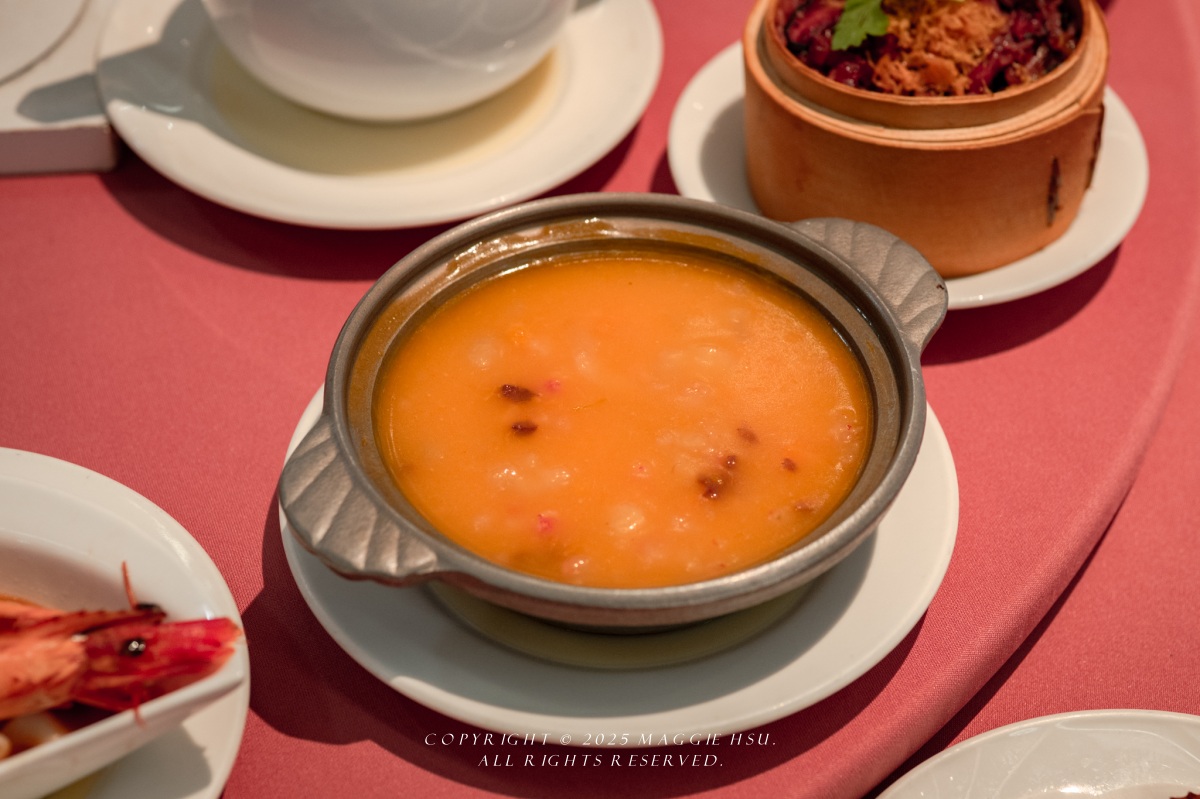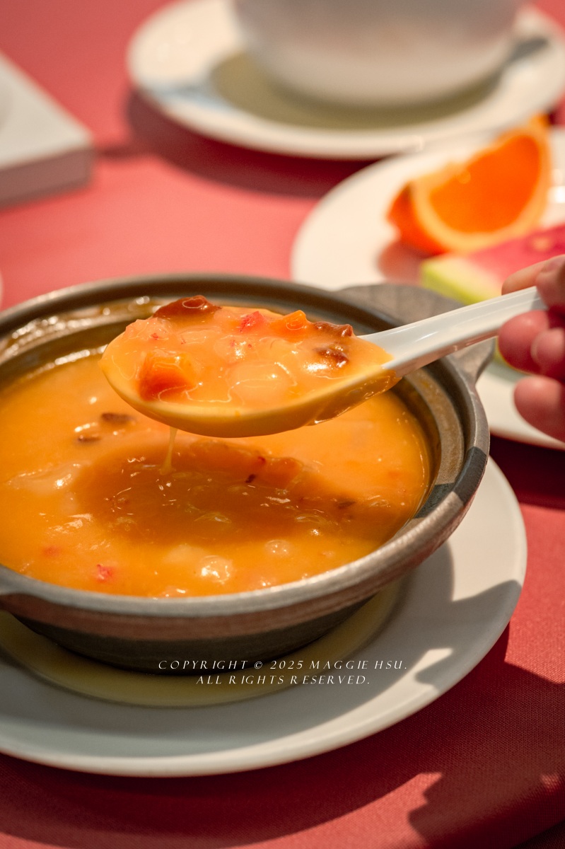 一般婚宴上常見的米糕,多半是傳統未調味的版本,但這道加入了紅麴元素,第一口就讓人驚喜。紅麴的香氣淡雅溫潤,讓整體風味更有層次,上頭的干貝酥金黃酥香,咬下去帶點脆感,與軟糯的米糕形成完美對比。整體味道濃郁卻不厚重,越吃越順口,我可以輕鬆吃上好幾碗啊!