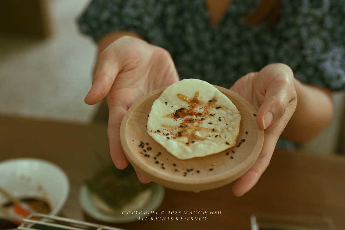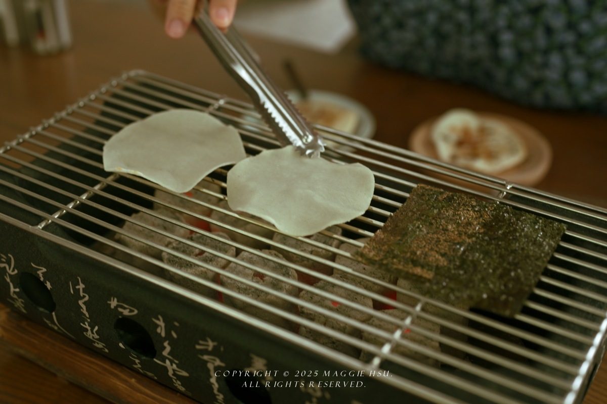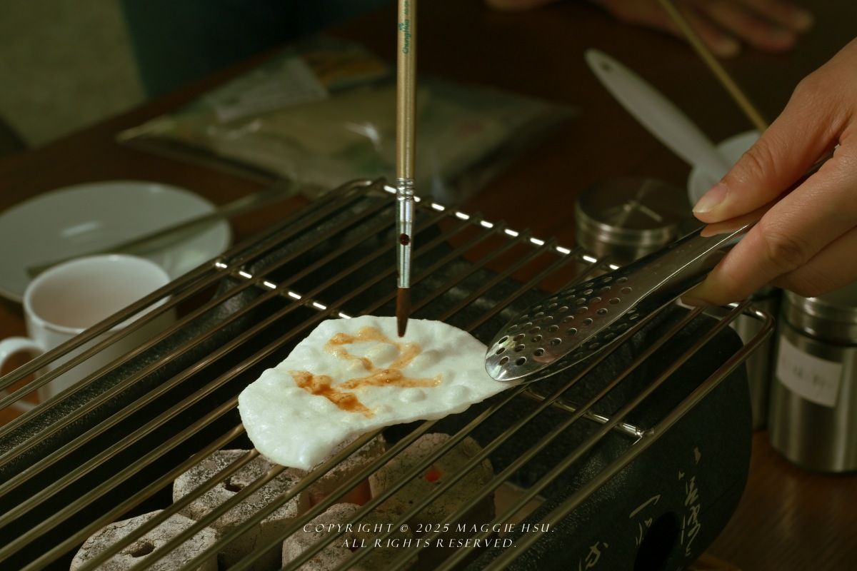 我們跟著接班人參觀了廠區,才發現醬油從新鮮的豆子到裝瓶,要經過選、蒸、酵,壓、靜、殺等六個重點步驟。從傳統陶缸抽取出的原汁,還得過濾雜質,檢測品質後與裝瓶,每一道工序都格外嚴謹,每一滴都凝聚了匠人的用心。接著,我們進入室內體驗烤仙貝 DIY。這項體驗靈感來自日本香噴噴的烤仙貝,看著表面慢慢澎起,微微焦脆的樣子就很誘人。刷上「一品醇」的手工醬油後,味道純粹又香濃,即便醬刷得稍多也不會死鹹,反而更香。
