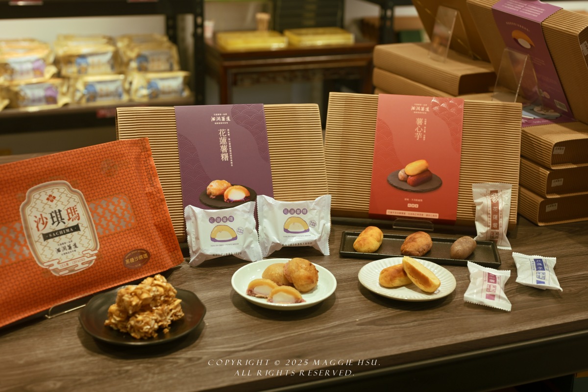 「沙琪瑪」則有鹹與甜兩種,蔥香及黑糖,口感不黏牙,吃起來酥脆刷嘴。萬年不敗的「花蓮薯」滋味純粹,吃不膩,採用花蓮在地蕃薯,可以吃到蕃薯本身的香氣。