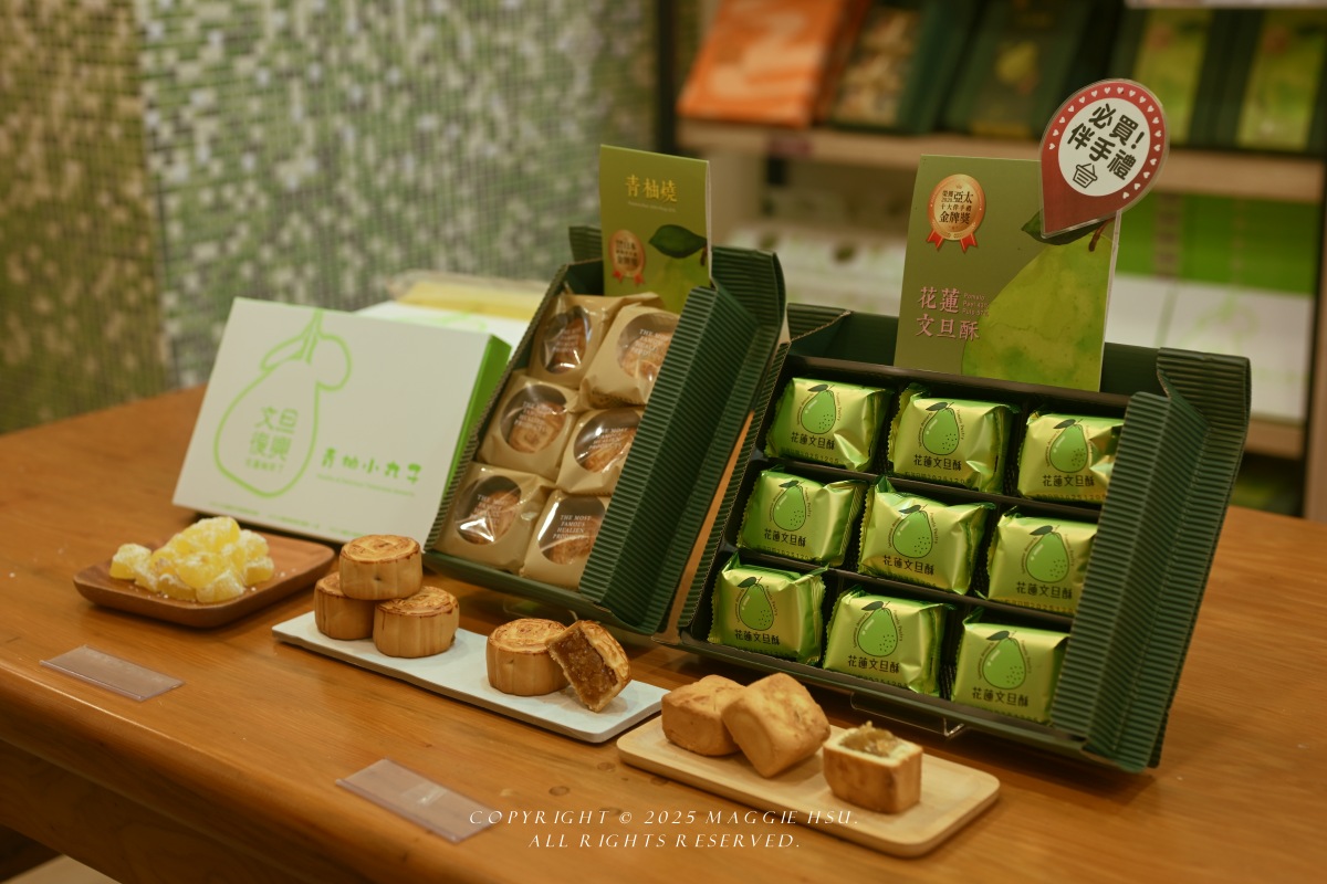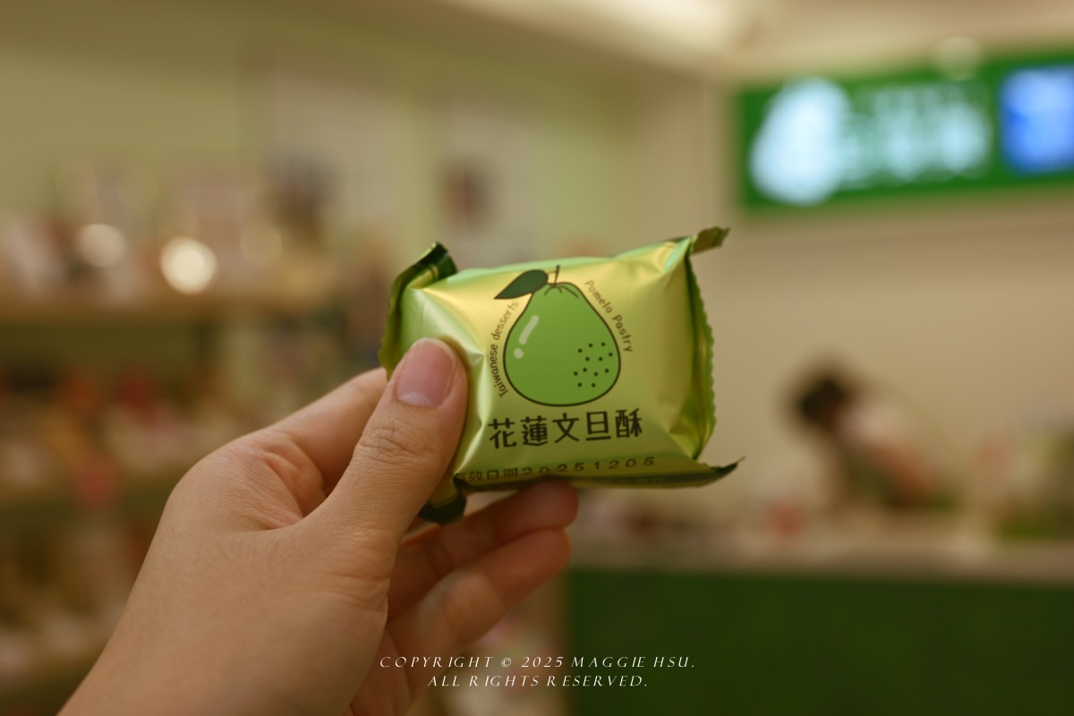 「花蓮文旦酥」吃得到滿滿的餡料,柚皮、柚子果肉一次享受,而且我才知道原來文旦柚的維他命C含量是檸檬的三倍,我超級需要(笑)也推薦一口一個大小的「青柚小丸子」,麻糬的QQ口感,採日式手法製作,不會甜膩,風味清香爽口。