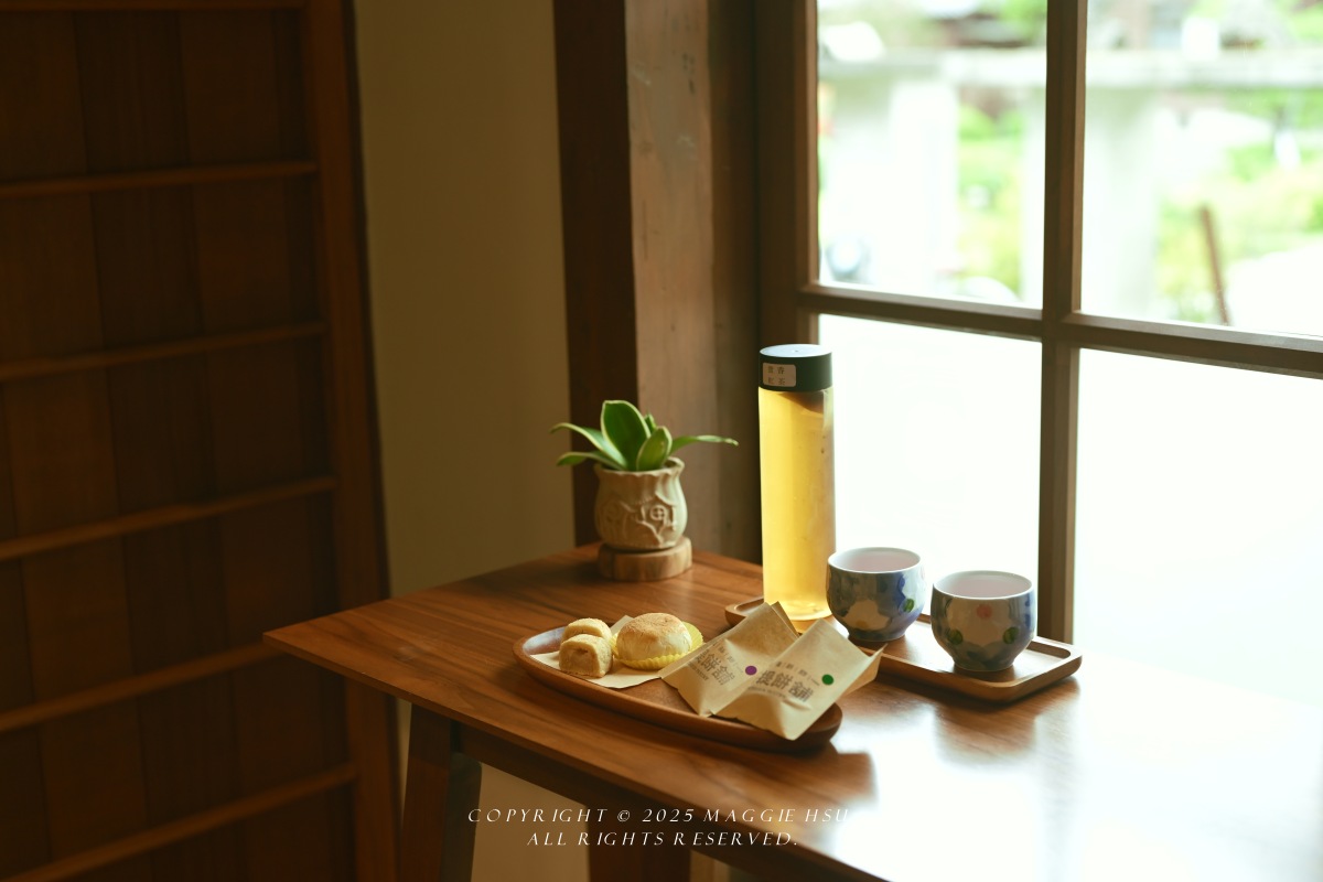 這次我們先在門市享用下午茶,坐在浸潤日式氛圍的木屋裡,倚窗望出去,正好能看到被列為古蹟的將軍府建築。邊賞景邊品嚐招牌的縣餅菩提酥,搭配清香冷泡茶,那滋味並非日式點心,而是花蓮土地的真實氣息,結合在地農產,十分接地氣。