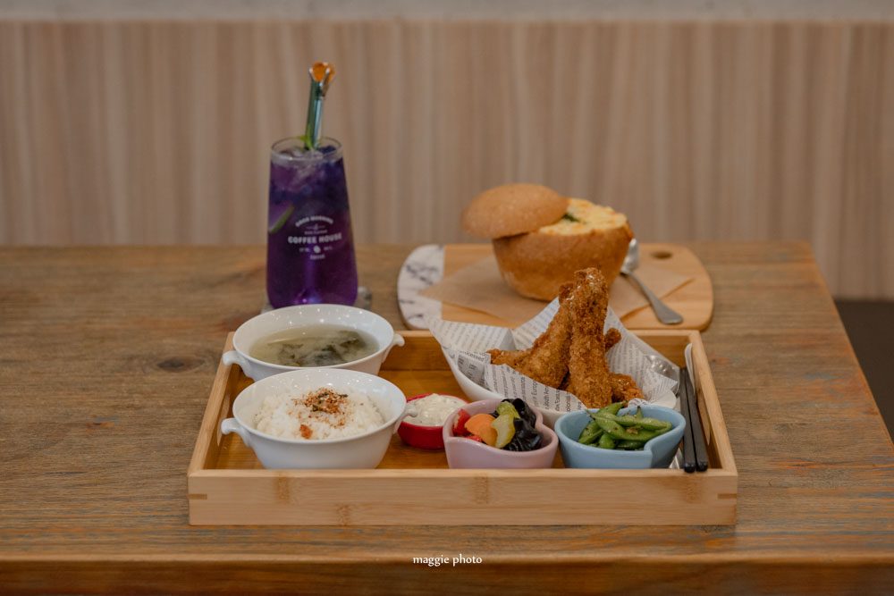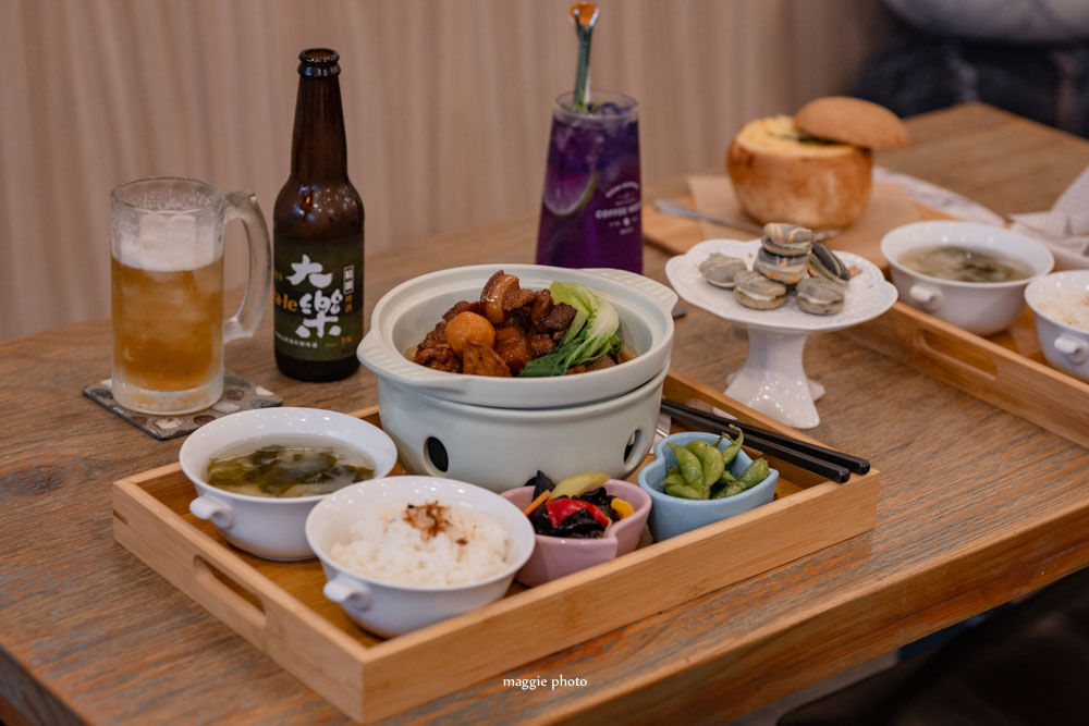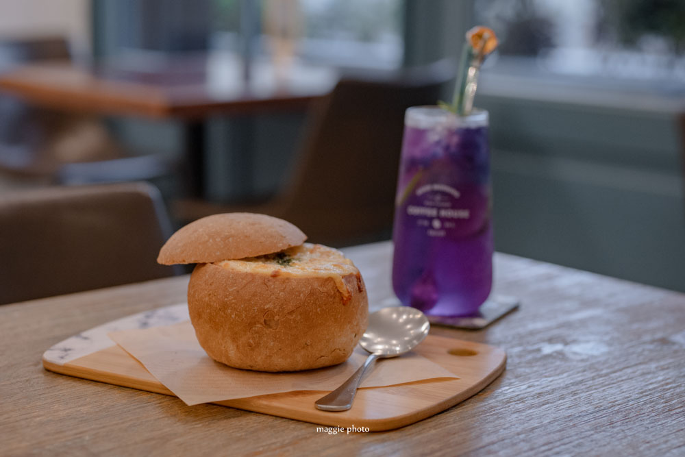 麵包盅濃湯是這裡的人氣特色料理之一。外層香酥的麵包盛裝著熱騰騰的玉米巧達湯,上層覆蓋著濃郁的 Double Cheese,十分滿足。飲品部分,強烈推薦那杯視覺系的「海洋檸檬」,加入蝶豆花後呈現出寶石般的藍紫色澤。偷偷告訴大家,如果想來點小微醺,莎莉好食自製的「大樂鮮釀啤酒」也相當順口,風味清爽,很適合在旅途的夜晚慢慢品嚐呦!