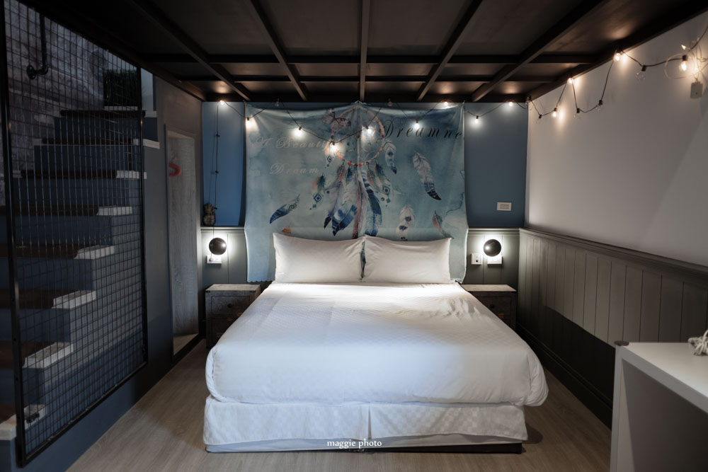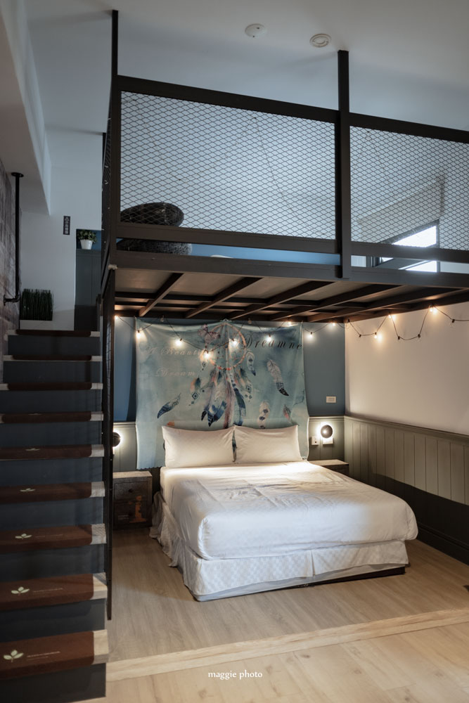 這間是樓中樓格局的四人房(看見山嵐四人套房),佈置十分溫馨。每間房都設有獨立陽台,風格與景致各異,踏出陽台,山嵐與海風便一同迎面而來,相當療癒。