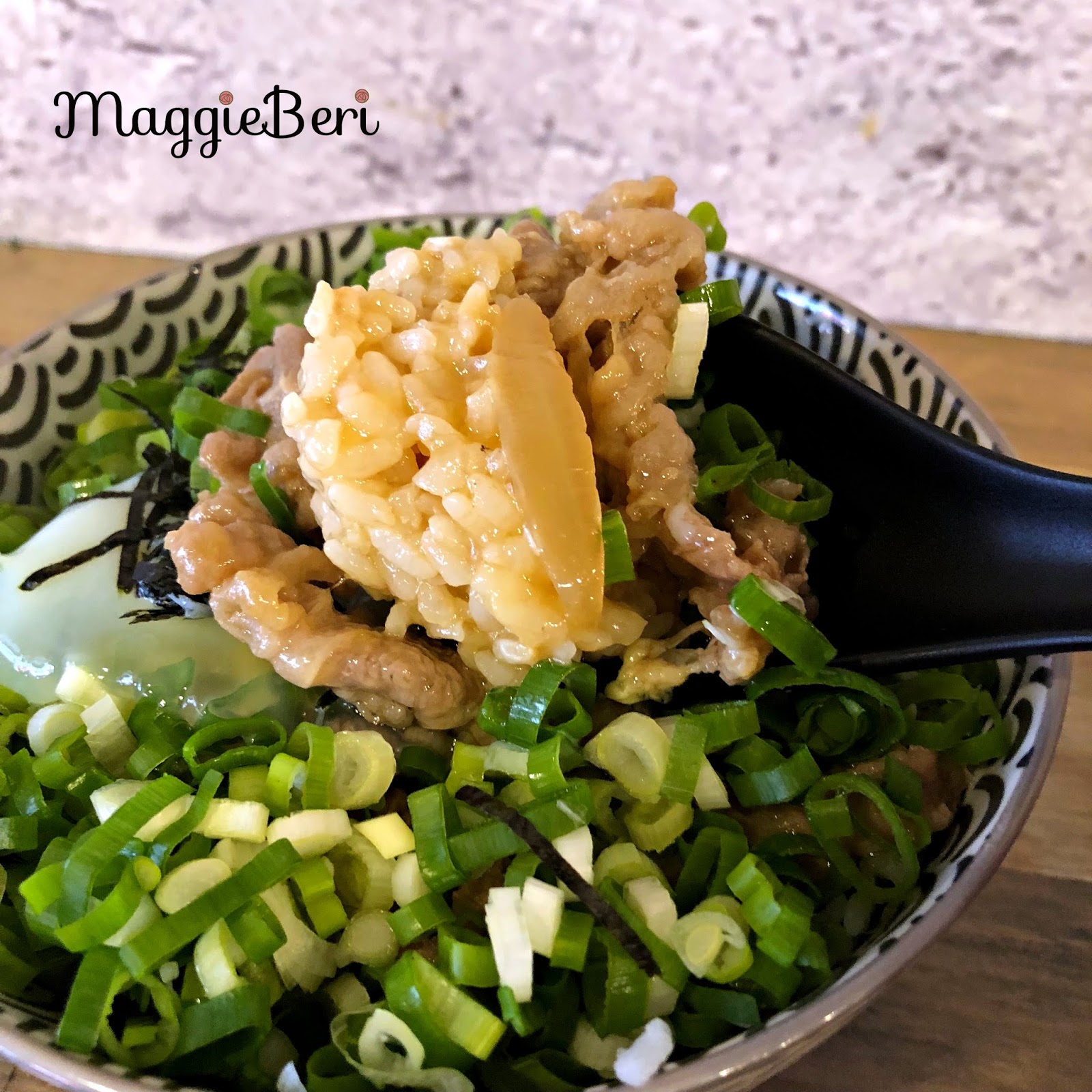 ▲ 將溫泉蛋戳破,將蔥、肉跟飯拌勻,真的好吃到不行(不誇張),原本很擔心蔥很多會不會太嗆,配上濃郁的蛋汁,中和掉蔥的嗆辣,這道超推!