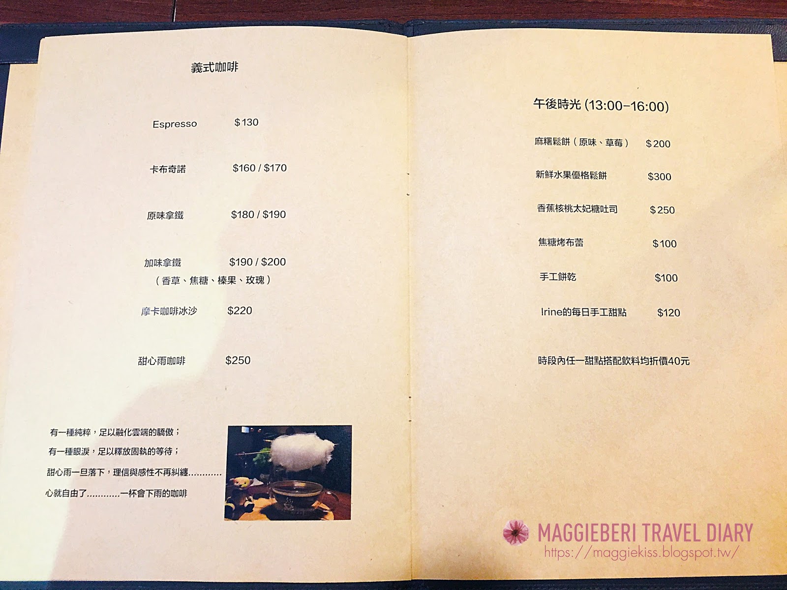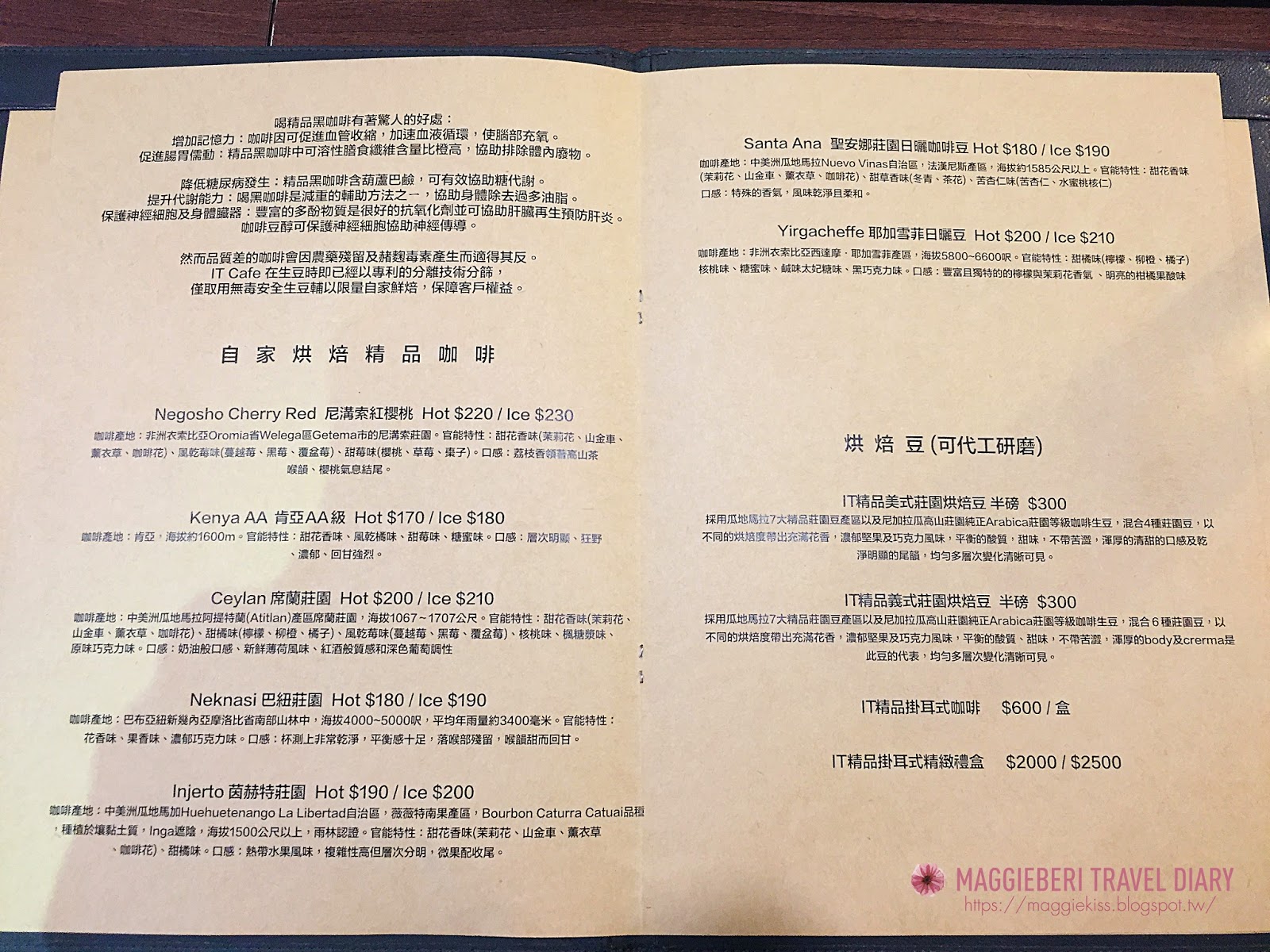 It’s Cafe提供多種餐點,從早午餐到下午茶都有,但仍以咖啡為主,咖啡除了常見的幾樣以外也有些特別的來自不同國家,可以參考目錄上的口感找到最符合自己心情的。