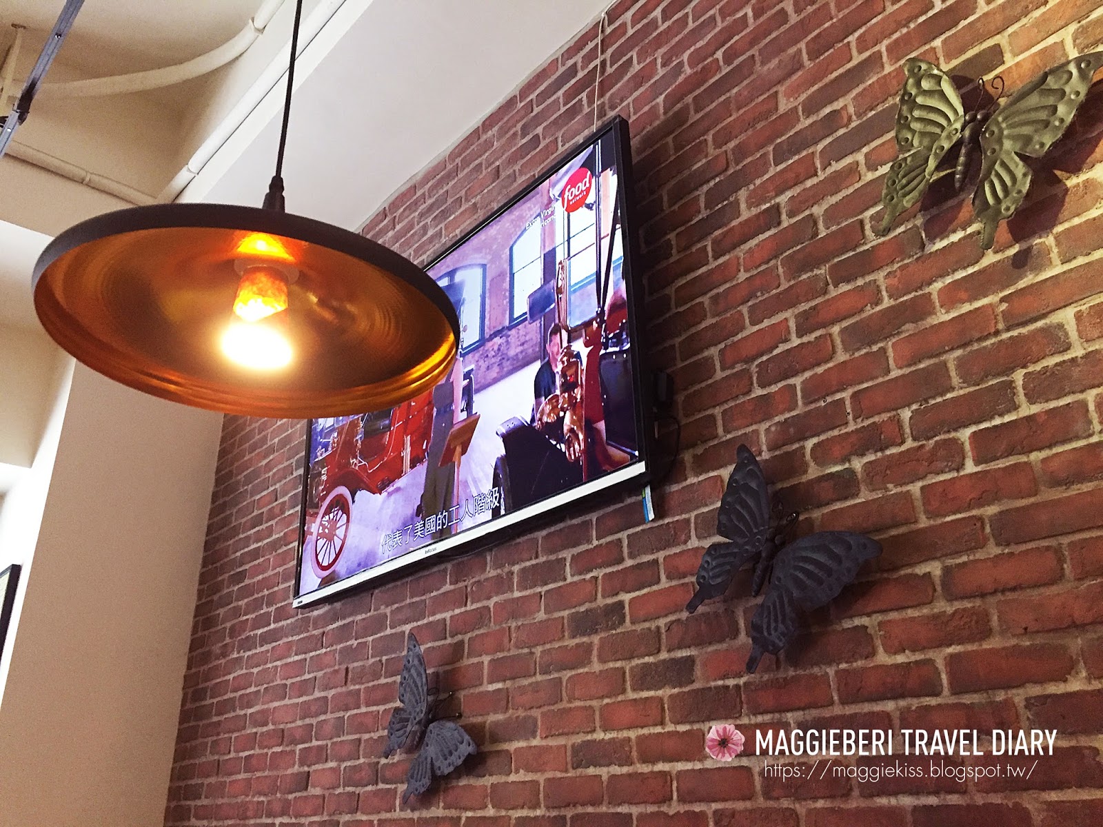 這面紅磚牆上掛了幾隻花蝴蝶,似乎透漏了老闆浪漫的一面,由於今天攜帶筆電,再加上今天的目的是工作,所以放棄了舒適的沙發區 (原本想當個懶人呀),選擇了隔壁的座位。