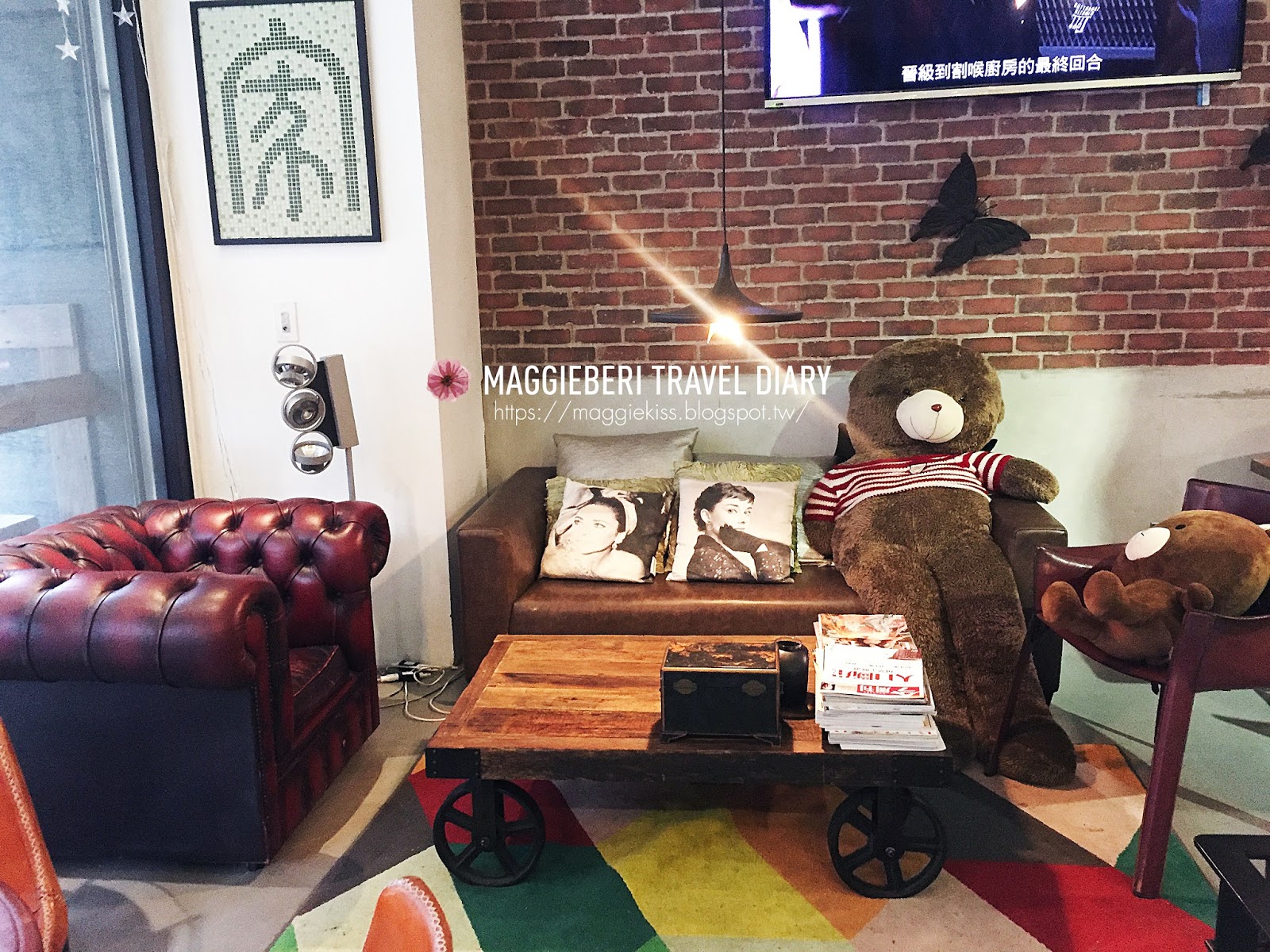 ▲整體環境的擺設以懷舊美式風格為主,好喜歡這塊沙發區,給人溫馨的感覺 ,有兩隻絨毛小熊坐鎮在這裡,大隻熊也太霸氣XD 什麼坐姿拉,可以給人左擁右抱耶 !