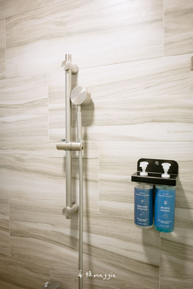 房內有配置小冰箱,空調很舒服,甚至還有電風扇和體重計。浴室水壓強勁卻親膚,沐浴與洗髮用品都是台灣品牌,滋潤又好用,還提供暖氣功能,沖澡完全很享受呢!