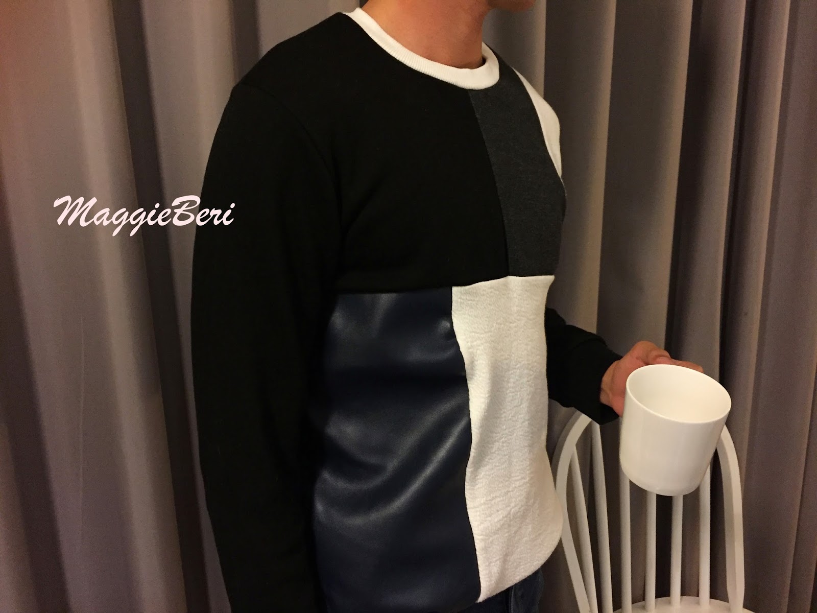 大學T 搭配再度出現,雖然是圓領的大學T,但是不規則幾何色塊的拼接,就與一般的不同。