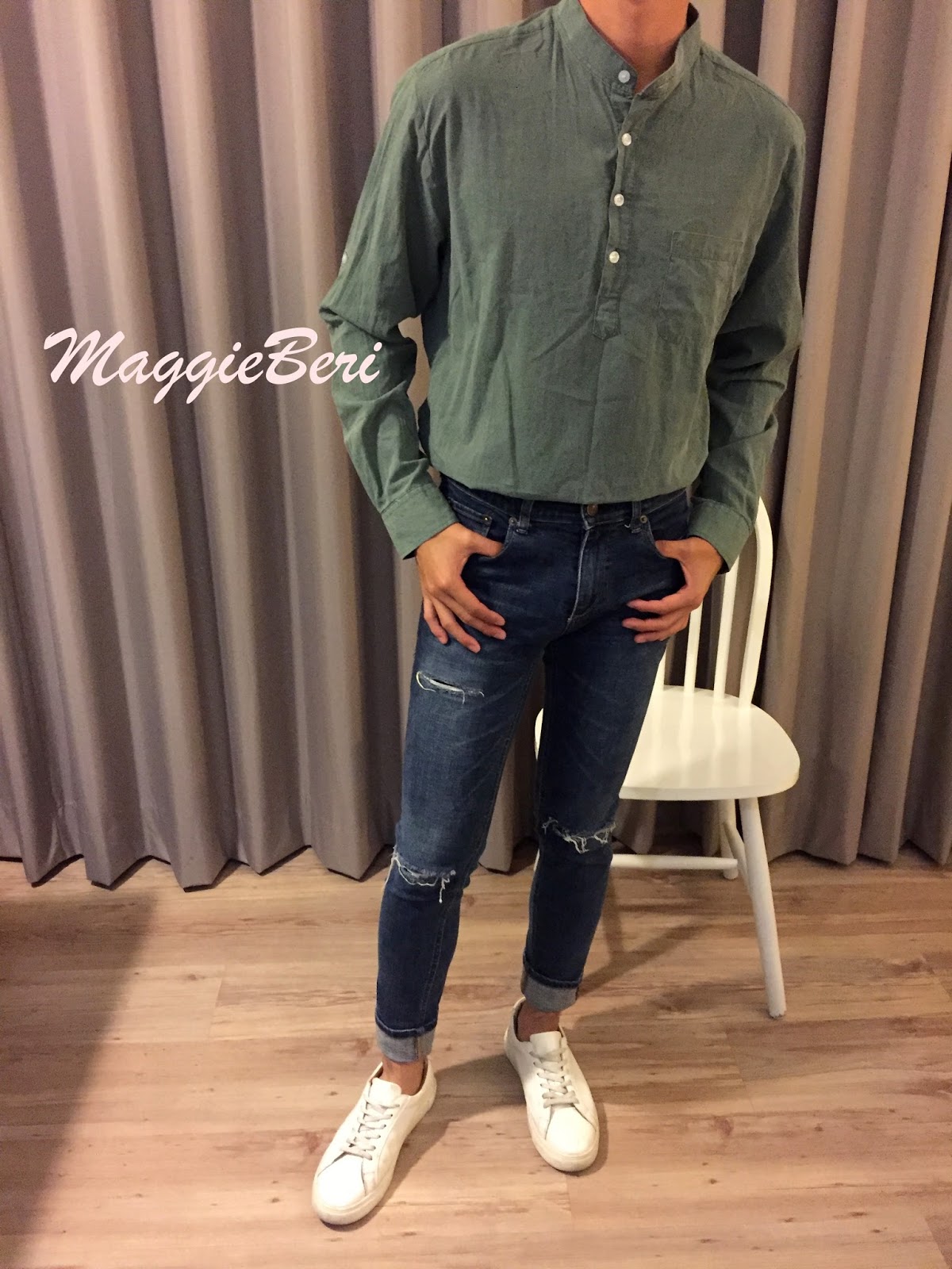 襯衫搭配牛仔褲,有種看似正裝又休閒的感覺,上面這款的顏色介於湖水綠跟墨綠色之間(不知道正確顏色名稱,誰來告訴我?)這件的顏色比較少見,如果不敢嘗試的人,可以選擇基本色。