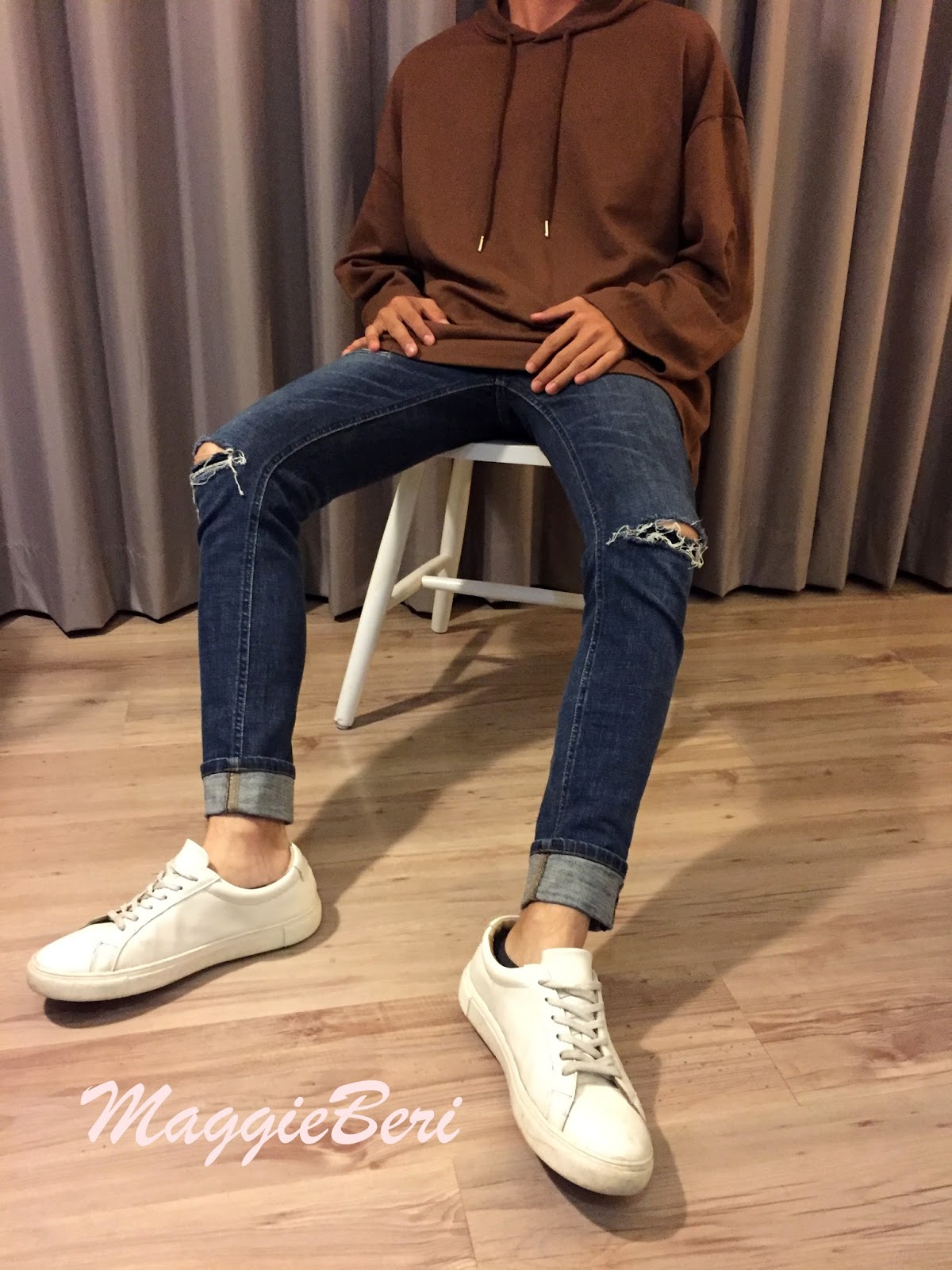 ▲ LOOK 3:寬鬆帽T+合身刷破牛仔褲+白鞋