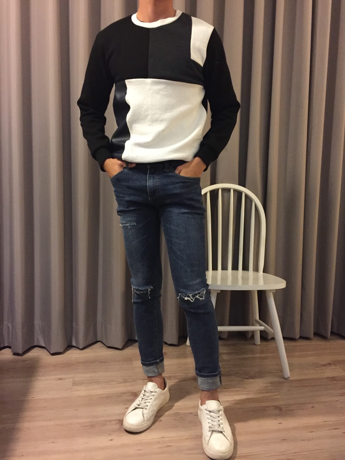 ▲ LOOK 4:深色毛衣+窄管牛仔褲+白鞋
