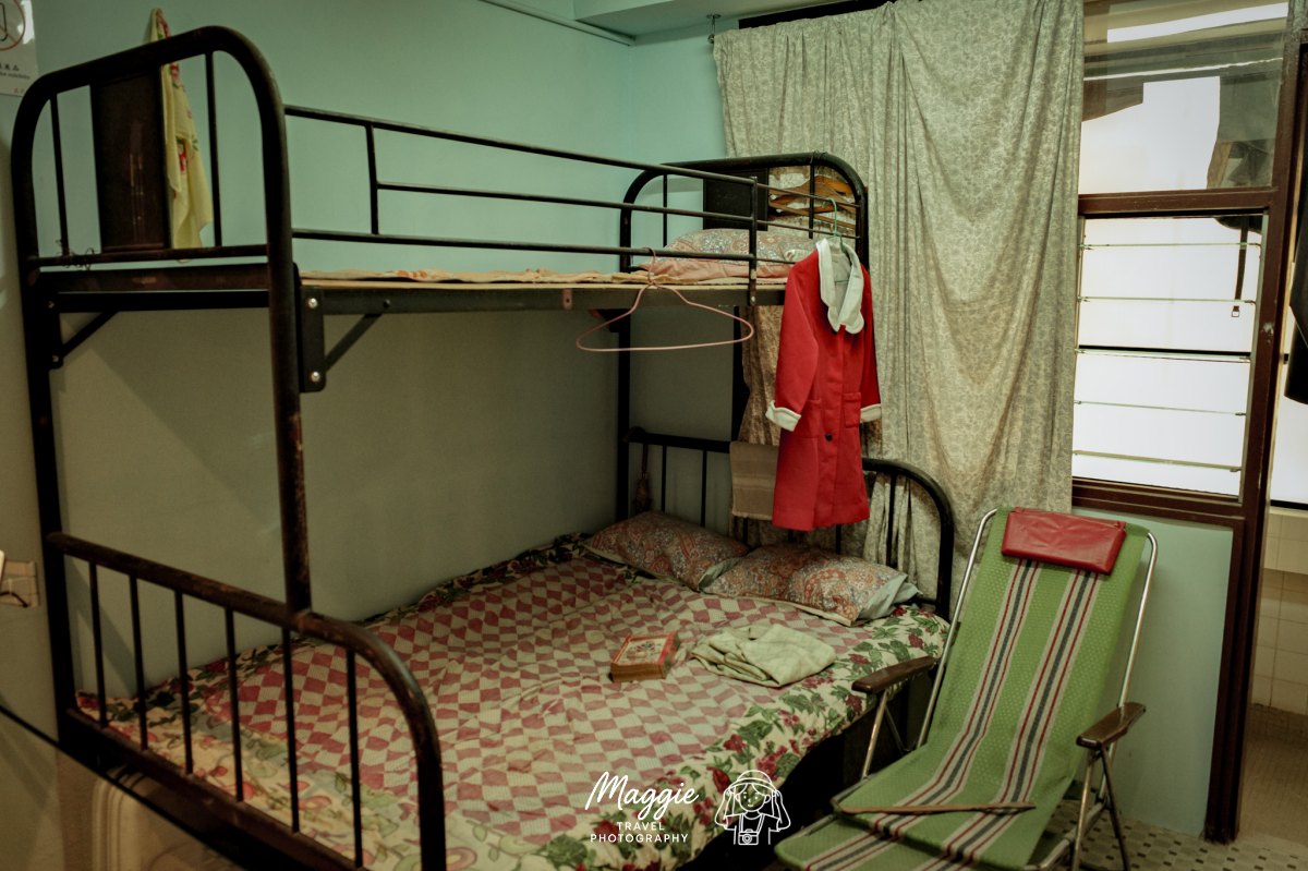 印象最深刻的公屋生活重現展區!以1950至1970年代的家庭為藍本,原尺寸還原公屋單位,床架都是木製的,屋內非常簡陋拮据,一家多口住在狹小的空間裡,可能一張床就要睡好幾人,而曬衣服大家會到頂樓,稱為天台曬衣場,婦女們一邊摺衣一邊閒話家常,小孩就在旁玩耍,跳格子、玩彈珠。